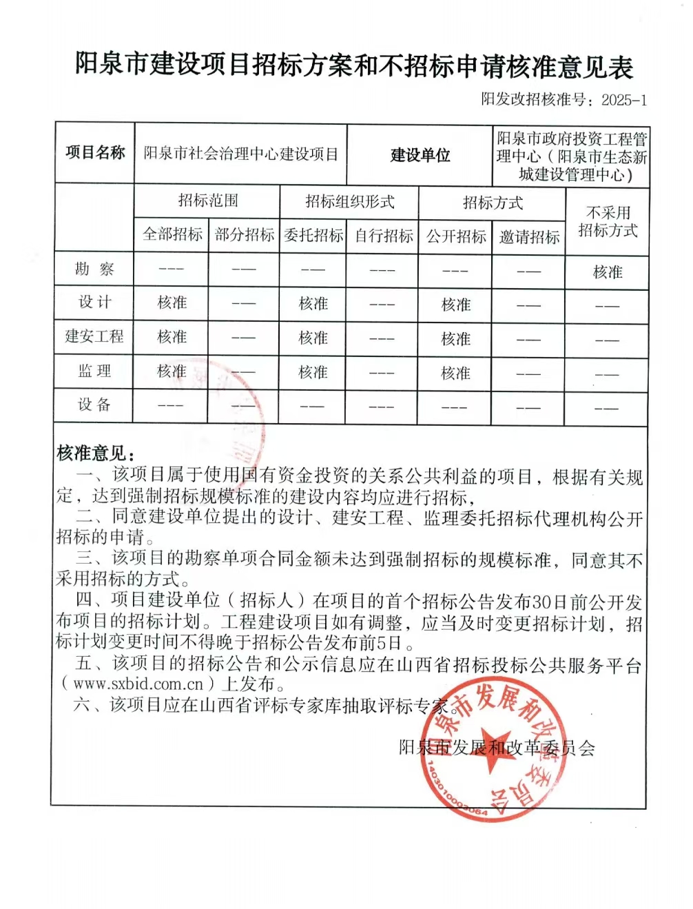 阳泉市社会治理中心建设项目招标方案和不招标申请核准意见表
