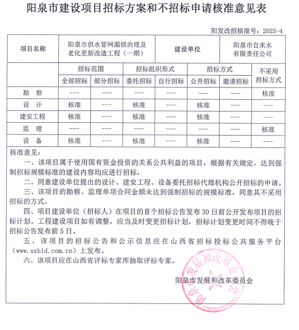 阳泉市供水管网漏损治理及老化更新改造工程(一期)招标方案和不招标申请核准意见表