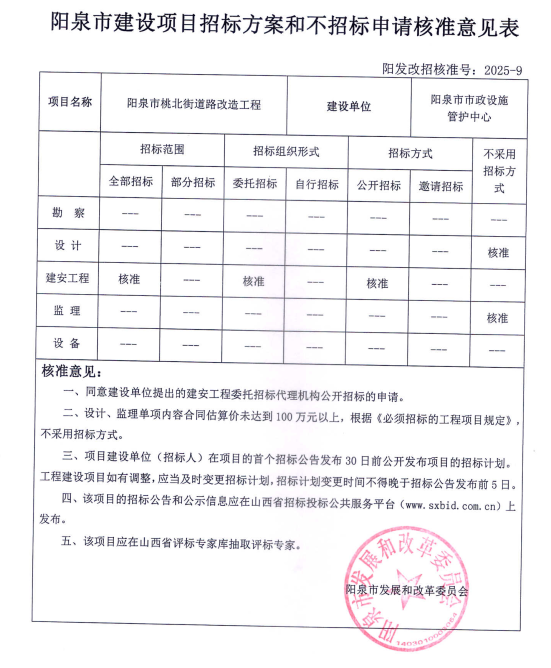 阳泉市桃北街道路改造工程招标方案和不招标申请核准意见表