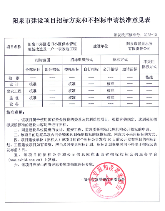 阳泉市郊区老旧小区供水管道更新改造及一户一表改造工程招标方案和不招标申请核准意见表