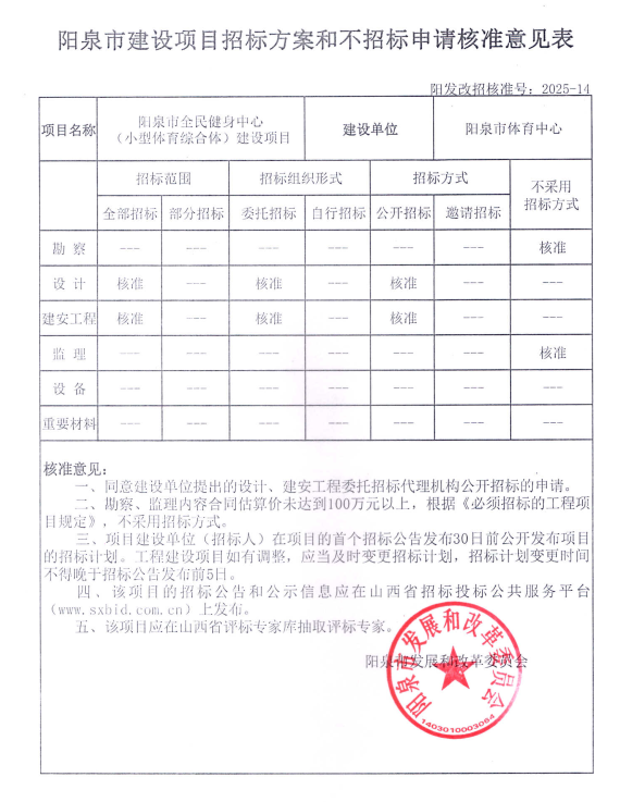 阳泉市全民健身中心(小型体育综合体)建设项目招标方案和不招标申请核准意见表