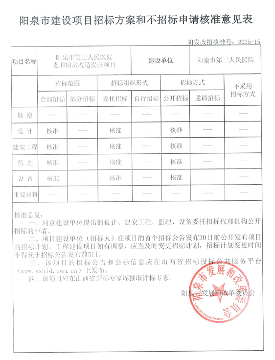 阳泉市第三人民医院老旧病房改造提升项目招标方案和不招标申请核准意见表