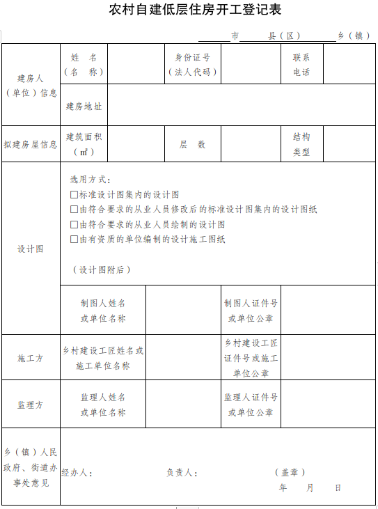 (四)建房人填写《农村自建低层住房开工登记表》(见附件1),送交乡(镇)人民政府、街道办事处规划建设办公室;